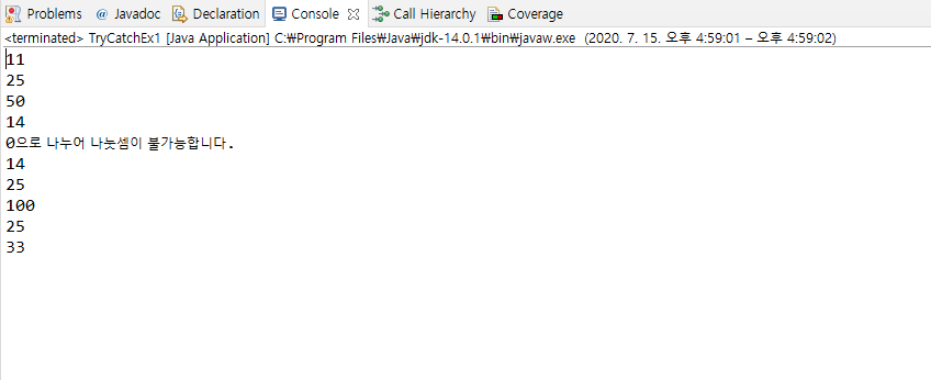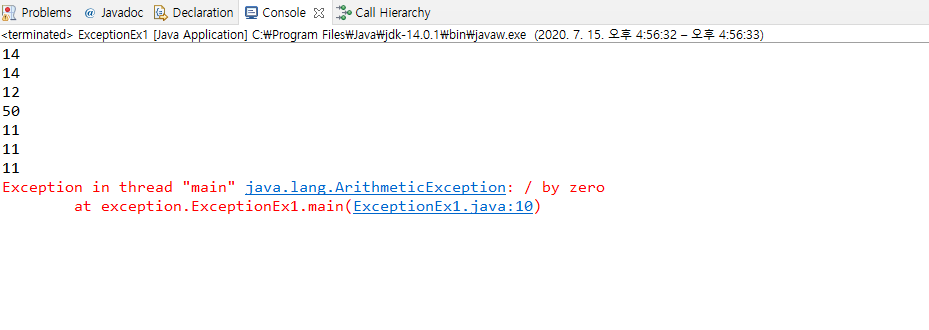 이것이 자바에서 지정한 0으로 나눴을때 예외처리이다.