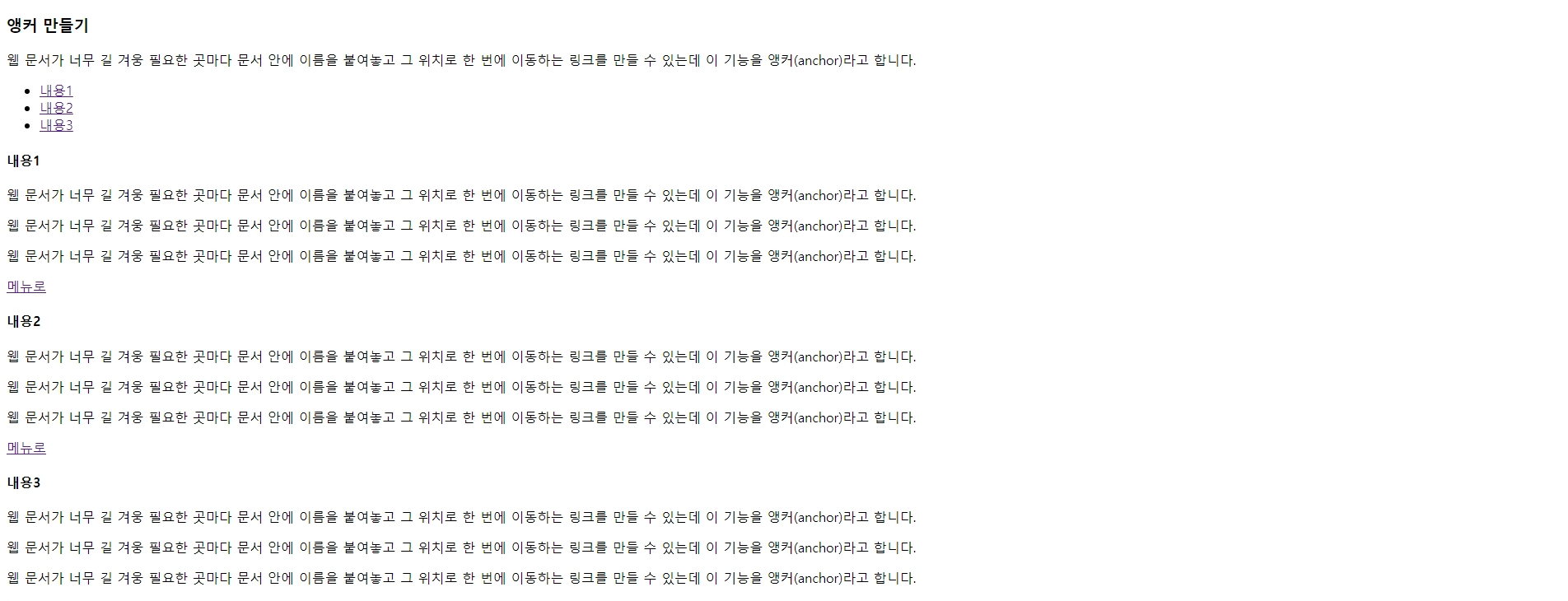 <p>웹 문서가 너무 길 겨웅 필요한 곳마다 문서 안에 이름을 붙여놓고 그 위치로 한 번에 이동하는 링크를 만들 수 있는데 이 기능을 앵커(anchor)라고 합니다.</p>