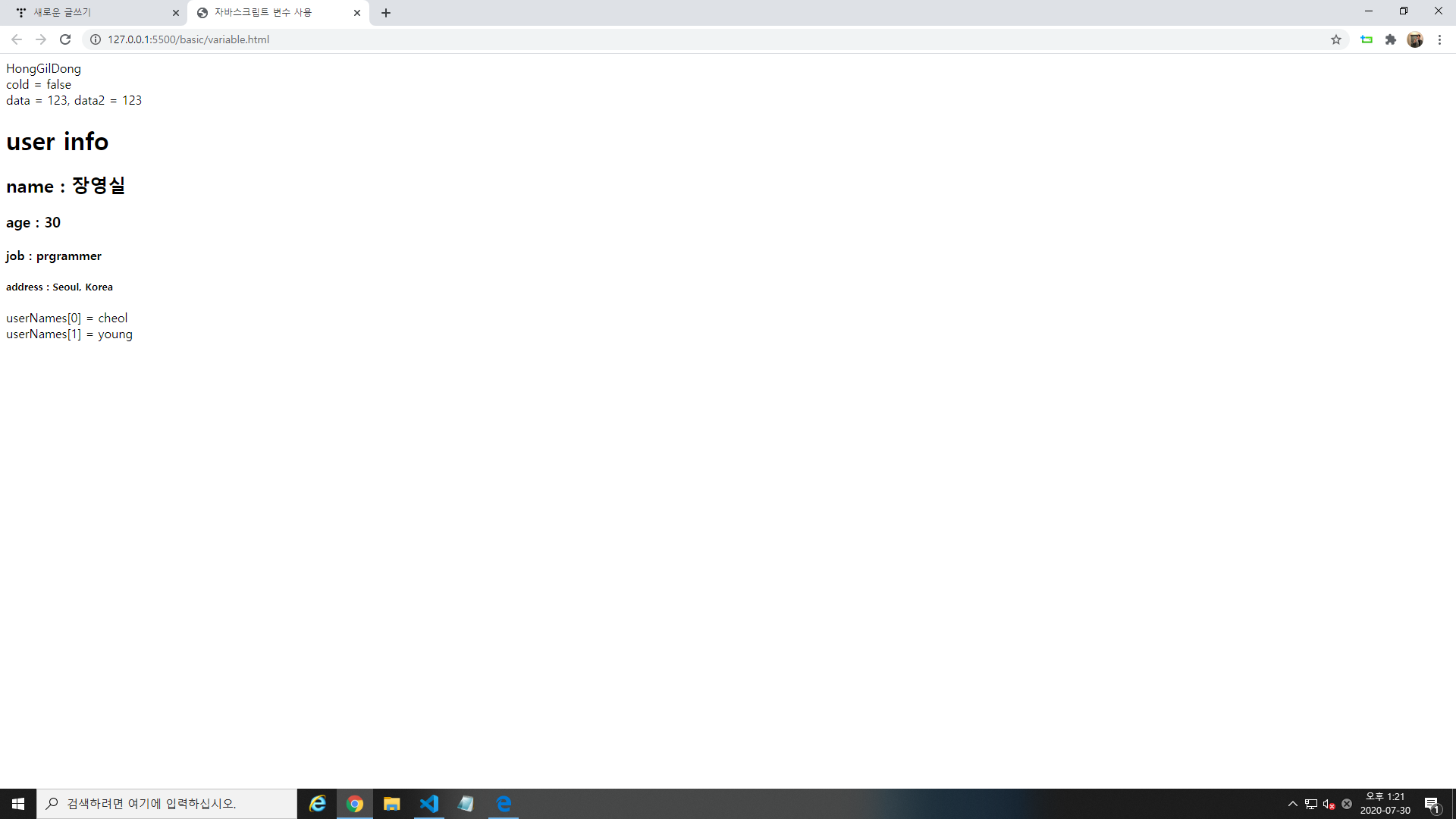 <title>자바스크립트 변수 사용</title>