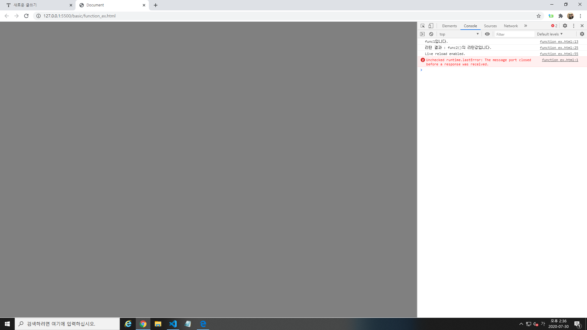 웹 페이지 콘솔 창을 따로 띄워서 봐야한다.