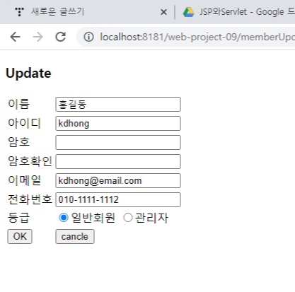 수정 요청의 처리는 MemberUpdateServlet의 doPost()에서 구현