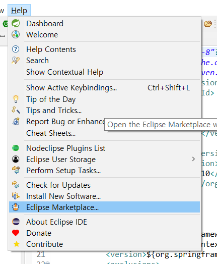 [Hep] > [Eclipse Marketplace] 를 들어간다.