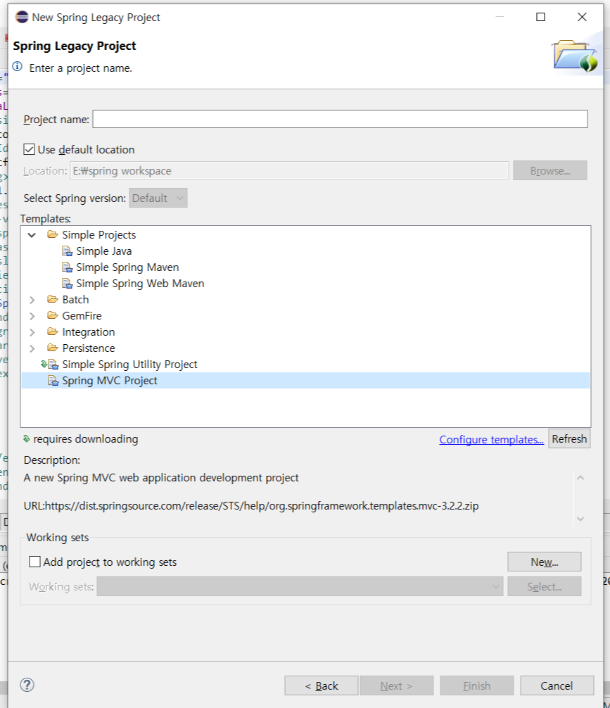 Project name를 정하고 Spring MVC Project를 선택한다.
