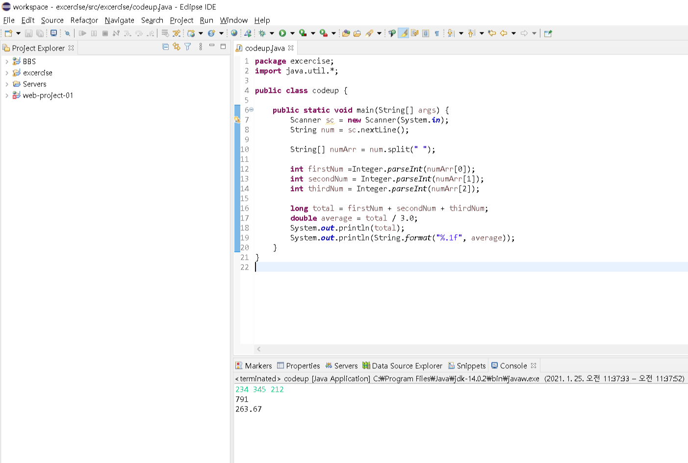 그리고 배열에 저장된 3개의 값을 이용하여 합과 평균을 구한다.