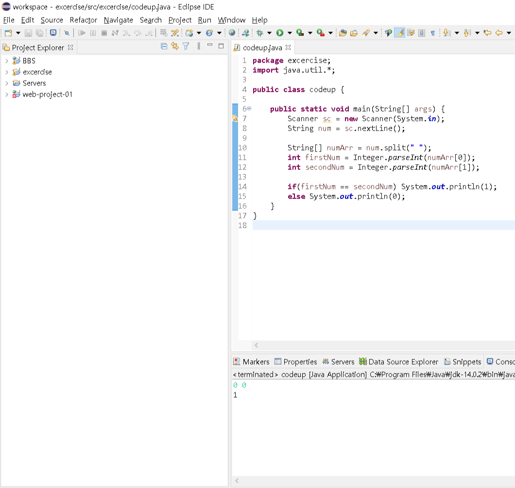 두 정수가 공백을 두고 입력됐을 때 서로 같은지를 확인하여 참일때는 1 거짓일때는 0을 출력한다.