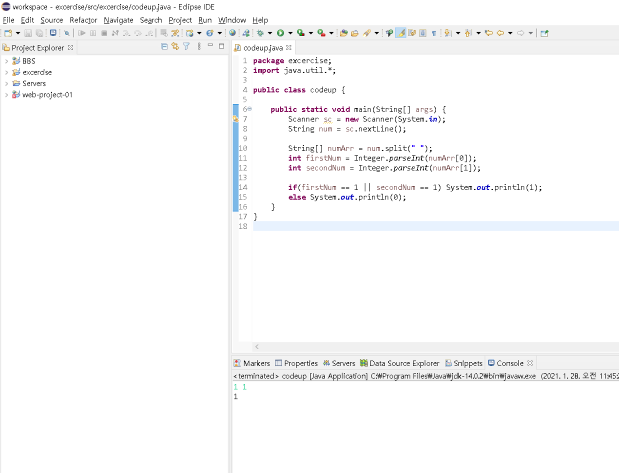 if(firstNum == 1 || secondNum == 1) System.out.println(1);