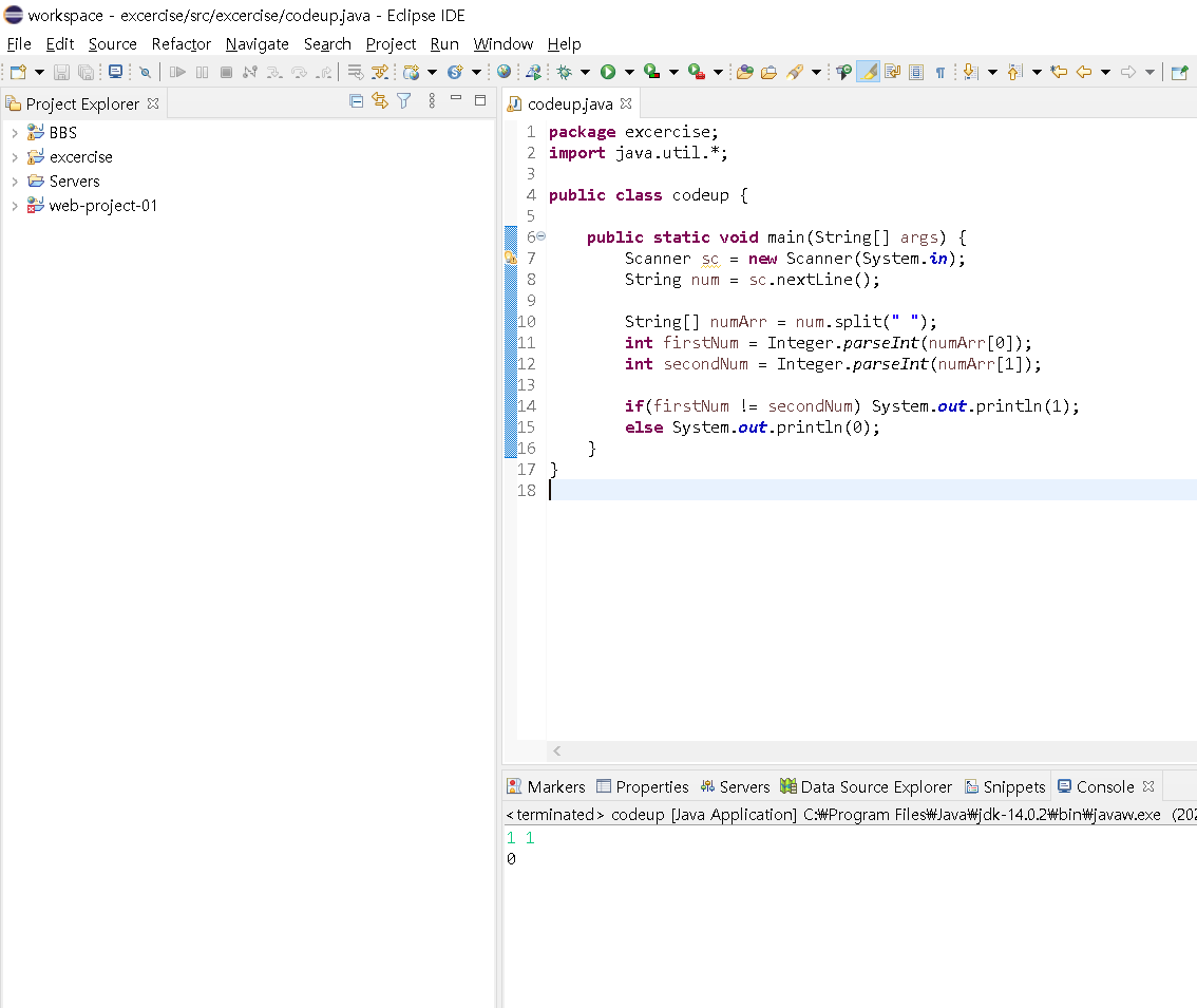if문을 사용하여 같지않은 조건에서 1을 출력하고 그 이외 조건(else)에서는 0이 출력되게한다.